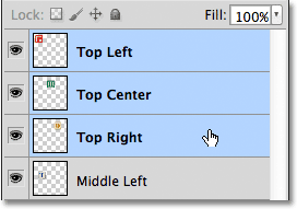 با پایین نگه داشتن کلید Shift و کلیک روی لایه Top Right ، لایه های Top Center و Top Right را نیز انتخاب می کنیم. با این کار ، لایه Top Left انتخاب شده ، و لایه Top Right نیز به قسمت انتخاب اضافه می شود و هم چنین لایه Top Center نیز در بین آنها انتخاب می شود. اکنون هر سه لایه به یکباره انتخاب شده اند: