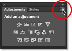 برای خاموش کردن ماسک پیش فرض برای لایه های Adjustment ، در واقع باید از پنل Layers به پنل Adjustments برویم. روی آیکون منو در گوشه بالا سمت راست پنل Adjustments کلیک کنید: