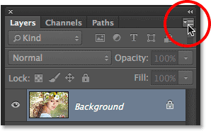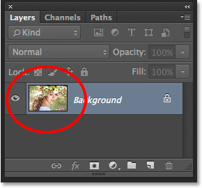 اگر به پنل Layers نگاه کنیم ، می بینیم که تصویر ما روی لایه Background نشسته است. ما می دانیم که تصویر روی لایه Background قرار دارد ؛ زیرا فتوشاپ تصویر بند انگشتی پیش نمایش محتوای لایه را به ما ارائه می دهد: