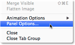 بسته به آن چه که برای ما مهم تر است ، می توانیم اندازه تصویر کوچک پیش نمایش را تغییر دهیم. تصاویر کوچک پیش نمایش بزرگ تر ، دیدن محتوای هر لایه را برای ما راحت تر می کنند ، در حالی که تصاویر کوچک پیش نمایش کوچک تر باعث می شوند که صفحه تمیز و مرتب باشد. یکی از روش های تغییر اندازه تصویر بند انگشتی از طریق منوی پنل Layers است. روی آیکون کوچک منو در گوشه بالا ، سمت راست پنل Layers کلیک کنید: