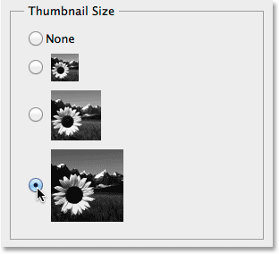 با این کار ، کادر محاوره ای Layers Panel Options باز می شود. در بالای کادر ، گزینه های Thumbnail Size وجود دارد. ما می توانیم اندازه کوچک ، متوسط یا بزرگ را انتخاب کنیم که با سه تصویر با اندازه های مختلف نشان داده شده است یا اگر اصلاً نمی خواهید تصویر کوچک پیش نمایش را مشاهده کنید ، None را انتخاب کنید. انتخاب هر کدام از آنها به سلیقه شما بستگی دارد. ما در این جا تصویر با اندازه بزرگ را انتخاب می کنیم: