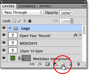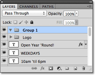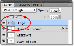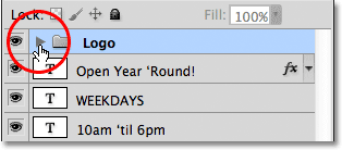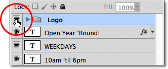یکی از مزایای استفاده از گروه های لایه ، علاوه بر منظم نگه داشتن کارها ، این است که روشن یا خاموش کردن هم زمان چندین لایه در سند را آسان می کند. به طور معمول ، برای روشن یا خاموش کردن یک لایه ، می توانیم روی آیکون مشاهده لایه آن ("کره چشم") در سمت چپ لایه در پنل Layers کلیک کنیم. ما می توانیم همین کار را با گروه های لایه نیز انجام دهیم. هم چنین ، هر گروه آیکون قابلیت مشاهده بودن خود را دارد. با کلیک روی کره چشم ، گروه “Logo" را به طور موقت خاموش می کنیم: