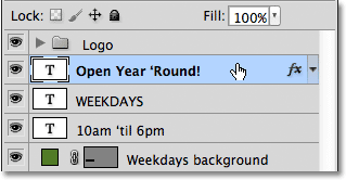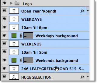 یک روش بهتر این است که ابتدا لایه هایی را که می خواهیم درون گروه قرار دهیم ، انتخاب کنیم. برای مثال ، فرض کنید ، می خواهیم لایه هایی را که آدرس مرکز باغ و ساعات کار را نشان می دهد (در گوشه پایین سمت چپ طرح) برداریم و آنها را درون گروه خود قرار دهیم. در کل هشت لایه وجود دارد که باید آنها را انتخاب کنیم. برای انجام این کار ، با کلیک بر روی بالاترین لایه مورد نظر خود شروع می کنیم (لایه متن " Open Year 'Round "):