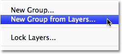 از منوی ظاهر شده ، گزینه New Group from Layers را انتخاب می کنیم. حتی اگر در واقع بخواهیم یک گروه جدید از گروه های دیگر ایجاد کنیم ، هنوز هم فتوشاپ به ما می گوید: "گروه جدید از لایه ها" :