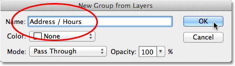 Photoshop با باز کردن یک کادر محاوره ای ، از شما می خواهد گروه جدید را نامگذاری کنید. نام آن را " Address / Hours " می گذاریم. پس از اتمام کار ، OK را کلیک کنید تا کادر محاوره ای بسته شود: