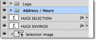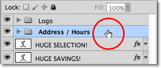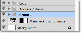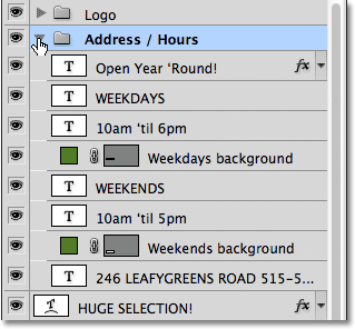اکنون ، می توانیم در پنل Layers ببینیم که یک گروه لایه جدید به نام " Address / Hours " ، در زیر گروه "Logo" نشسته است. همان طور که قبلاً اشاره کردیم ، گروه جدید به طور پیش فرض بسته شده است ، بنابراین لایه ها در حال حاضر درون آن قرار دارند: