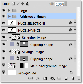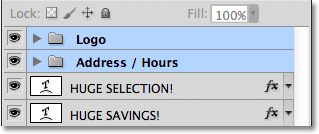 برای پایان دادن به سازماندهی پنل Layers خود ، به سرعت تمام لایه های ستون مرکزی طرح خود را انتخاب می کنیم (متن و تصاویر " “Huge Savings! و " Huge Selection!"):
