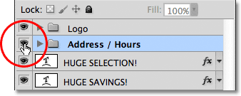 همان طور که قبلاً با گروه “Logo" مشاهده کردیم ، اکنون می توانیم با کلیک بر روی آیکون قابلیت مشاهده گروه ، تمام لایه های داخل گروه " Address / Hours" را یک باره خاموش کنیم: