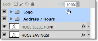 فتوشاپ ، نه تنها به ما اجازه می دهد تا لایه ها را با هم گروه بندی کنیم ، بلکه اجازه می دهد گروه های لایه را نیز گروه بندی کنیم! به عنوان مثال ، ما می خواهیم دو گروه لایه ای را که قبلاً اضافه کرده ایم (“Logo" و “Address / Hours" ) ، هر دو را در گروه جدید دیگری قرار دهیم. گروه بندی دو یا چند گروه لایه با هم هیچ تفاوتی با گروه بندی لایه های جداگانه ندارد. ابتدا باید گروه های مورد نظر خود را انتخاب کنیم. ما قبلاً گروه " Address / Hours " را انتخاب کرده ایم ، بنابراین کلید Shift را نگه داشته و روی گروه "Logo" بالای آن کلیک می کنیم. با این کار هر دو گروه هم زمان انتخاب می شوند: