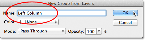 در کادر محاوره ایی ظاهر شده ، نام گروه را " Left Column" نامگذاری می کنیم ؛ زیرا محتویات گروه "Logo" و " Address / Hours" ستون سمت چپ طرح ما را تشکیل می دهند: