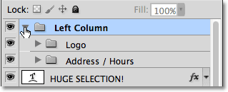 روی OK کلیک می کنیم تا کادر محاوره ای بسته شود. در این زمان Photoshop یک گروه لایه جدید به نام “Left Column" ایجاد می کند. اگر با کلیک بر روی آیکون مثلث ، گروه جدید را باز کنیم ، گروه های “Logo" و “Address / Hours" را در داخل آن می بینیم: