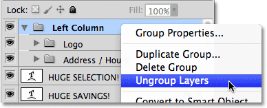 اگر بعد از این که لایه ها را با هم گروه کردید ، متوجه شدید که باید آنها را جدا کنید ، ساده ترین راه برای این کار کلیک راست (Win) / Control-click (Mac) در هر نقطه از گروه در پنل Layers است: