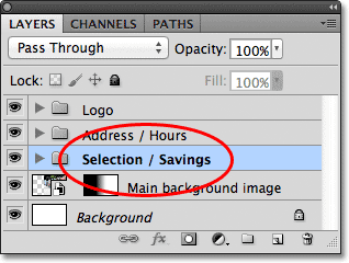 برای تغییر نام گروه و دادن نام توصیفی به آن ، مستقیماً روی نام گروه در پنل Layers دوبار کلیک کنید و نام جدید را تایپ کنید ، درست مثل این که یک لایه عادی را تغییر نام می دهید. ما نام آن را " Selection / Savings " می گذاریم. برای قبول تغییر نام ، کلید Enter (Win) / Return (Mac) را فشار دهید: