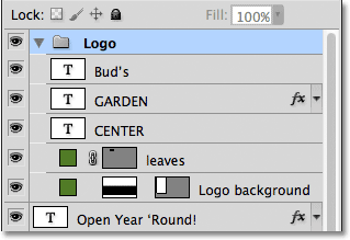 این کار گروه را باز می کند ، و لایه های داخل آن را نشان می دهد. فتوشاپ با ایجاد کمی تورفتگی به سمت راست ، به ما اجازه می دهد تا بدانیم کدام لایه ها در گروه قرار دارند. در این جا ، می توانیم ببینیم که گروه Logo ما شامل پنج لایه است: (“Bud's" ، "GARDEN" ، "CENTER" ، "leaves" و "Logo background"). برای بستن یک گروه لایه پس از باز کردن آن ، کافیست دوباره روی آیکون مثلث کلیک کنید: