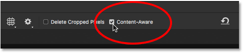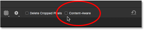 با انتخاب ابزار Crop ، گزینه Content-Aware در نوار Options در بالای صفحه ظاهر می شود. در حال حاضر ، این ویژگی را علامت گذاری نمی کنیم: