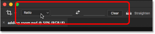 از آن جایی که می خواهیم دستگیره سمت بالا را بدون جابجایی سایر دستگیره ها بکشیم ، مطمئن می شویم که گزینه Aspect Ratio در نوار Options روی مقدار Ratio تنظیم شده باشد ، که گزینه پیش فرض است. و مطمئن می شویم که قسمت های Width و Height که مستقیماً در سمت راست گزینه Aspect Ratio قرار دارند ، خالی هستند. اگر خالی نبودند ، روی کلید Clear کلیک می کنیم تا مقادیر پاک شوند:
