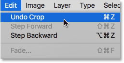 بنابراین ، اکنون که نحوه کار ابزار Crop را بدون قابلیت Content-Aware بررسی کردیم ، بیایید تصویر را دوباره صاف کرده و برش دهیم ، اما این بار با فعال بودن قابلیت Content-Aware این کار را انجام دهیم. با رفتن به منوی Edit در نوار منو و انتخاب گزینه Undo Crop ، برش اولیه خود را لغو می کنیم: