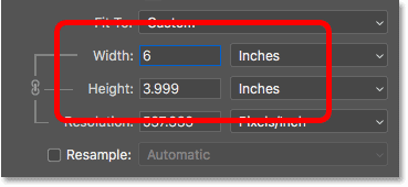 اگر بخواهیم ارتفاع را دقیقاً روی 4inch تنظیم کنیم، مقدار ارتفاع را، 4 اینچ وارد می کنیم. به محض وارد کردن مقدار ارتفاع، عرض بطور خودکار توسط فتوشاپ روی مقدار 6.001 اینچ تنظیم می شود. همانطور که مشاهده می کنید، نسبت ابعاد تصویرمان دقیقا 4x6 نیست، اما به آن خیلی نزدیک است: