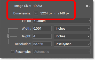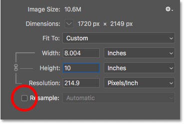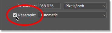 برای دیدن اینکه آیا تصویر کنونیِ شما، پیکسل های کافی برای چاپ در سایزِ مورد نظرتان را دارد یا خیر، گزینه ی Resample را روشن کنید. شما می توانید آن را درست در زیر گزینه Resolution پیدا کنید. وقتی که شما گزینه ی Resample، را خاموش می کنید، فتوشاپ دیگر به شما اجازه نمی دهد تا تعداد پیکسل های تصویر را تغییر دهید. ما فقط می توانیم سایزِ چاپ را تغییر بدهیم: