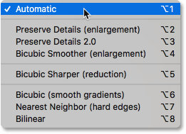 اگر بر روی کادر کشویی که در جلوی گزینه ی Resample قرار دارد، کلیک کنید، لیستی از متدهای interpolation برای انتخاب، باز می شود. بعضی از آنها برای upsampling و بعضی دیگر برای downsampling استفاده می شوند: