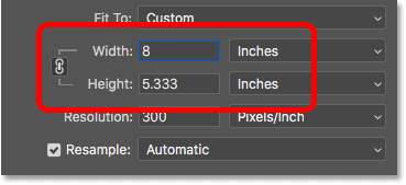 حال اگر عرض را روی 8inches تنظیم کنیم، فتوشاپ بطور خودکار ارتفاع را روی مقدار 5.333inches قرار می دهد. هیچ راهی وجود ندارد تا بتوانیم تصویری با نسبت ابعاد 4x6 را بصورت 8x10 چاپ کنیم:
