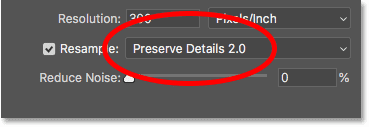 در فتوشاپ CC 2018، Adobe یک متد upscaling جدید، به نام Preserve Details 2.0 اضافه کرده است. این متد جدید اکنون بهترین گزینه برای بزرگ کردن تصاویر شما است. اما مشکلی وجود دارد وآن این است که اگر گزینه Interpolation را روی Automatic تنظیم کنید، دیگر فتوشاپ نمی تواند آن را انتخاب کند. بنابراین اگر شما از CC 2018 (یا نسخه های بعد از آن) استفاده می کنید و قصد دارید تصویرتان را upsampling کنید، متد interpolation را از مقدار Automatic به مقدار Preserve Details 2.0 تغییر دهید: