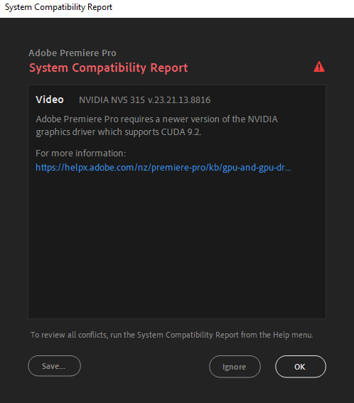 Premiere Pro دارای یک ابزار داخلی است که سیستم شما را اسکن می کند. این گزارش به صورت خودکار هنگامی که Premiere Pro را راه اندازی می کنید ، در صورت تشخیص مسائل شناخته شده با پیکربندی سیستم شما ، مانند درایورهای کارت گرافیک ناسازگار ، نمایش داده می شود.