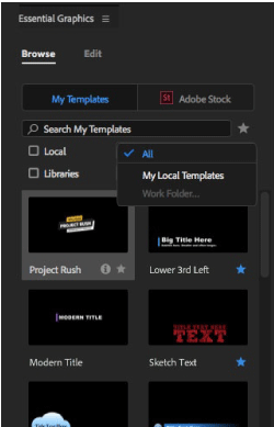 شما می توانید تمپلت های Motion Graphics را در پنل Essential Graphics مرور کنید. هم چنین می توانید تمام تمپلت های Motion Graphics را که به طور محلی ، یا در کتابخانه Creative Cloud ذخیره کرده اید و یا در Adobe Stock موجود هستند ، مشاهده نمایید.